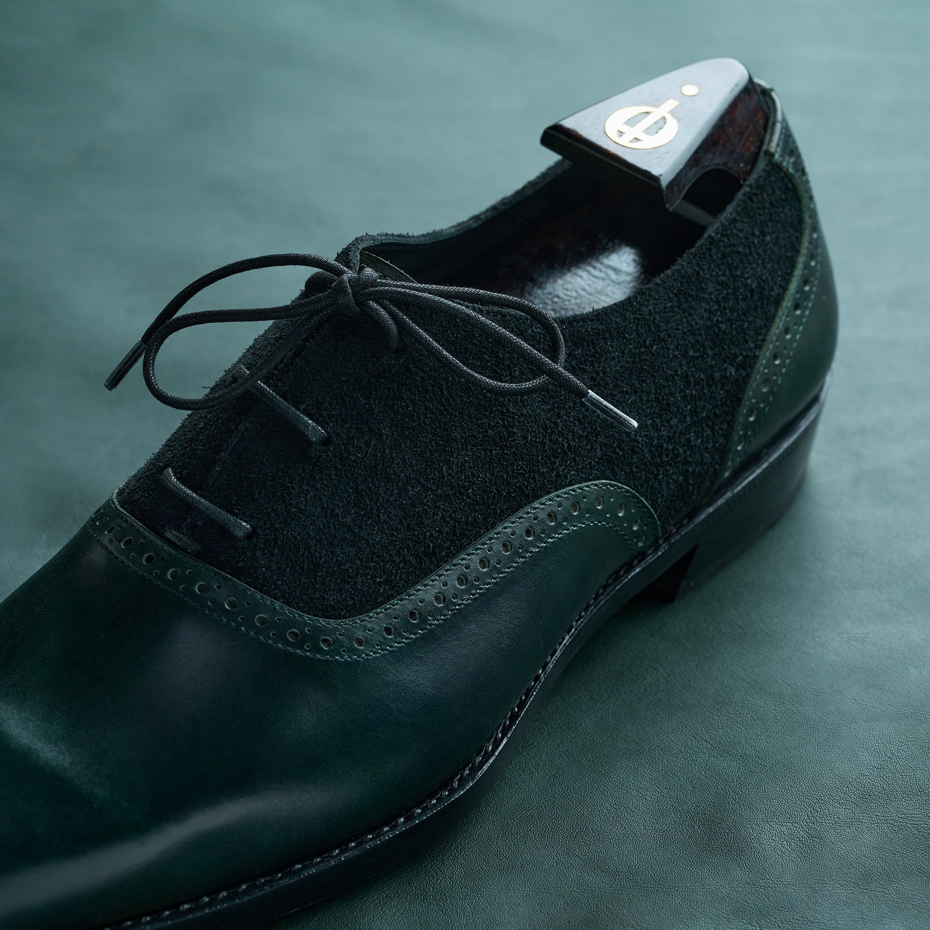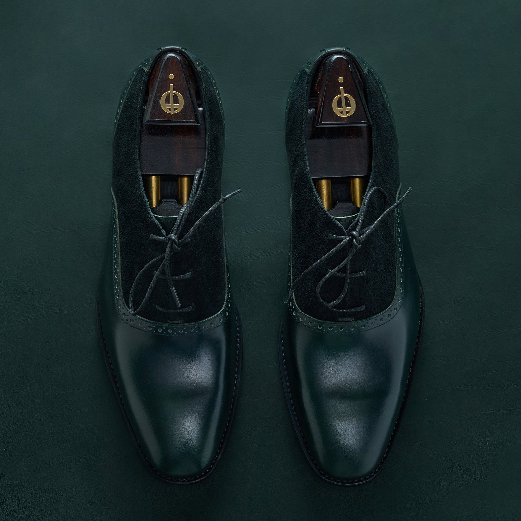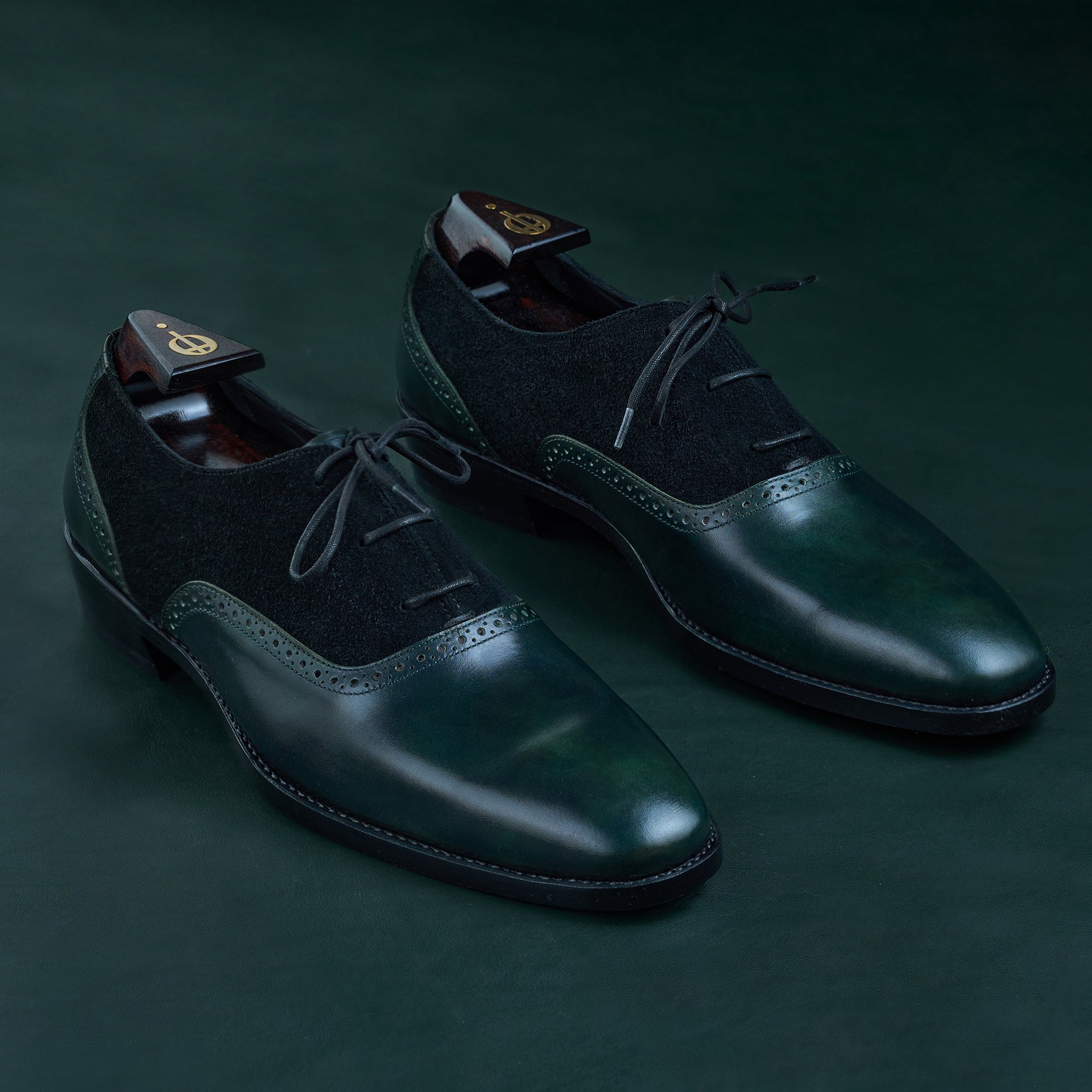 A timeless Adelaide Oxford crafted in emerald green museum calf from ILCEA, used across the vamp and counter, and contrasted with black suede quarters.