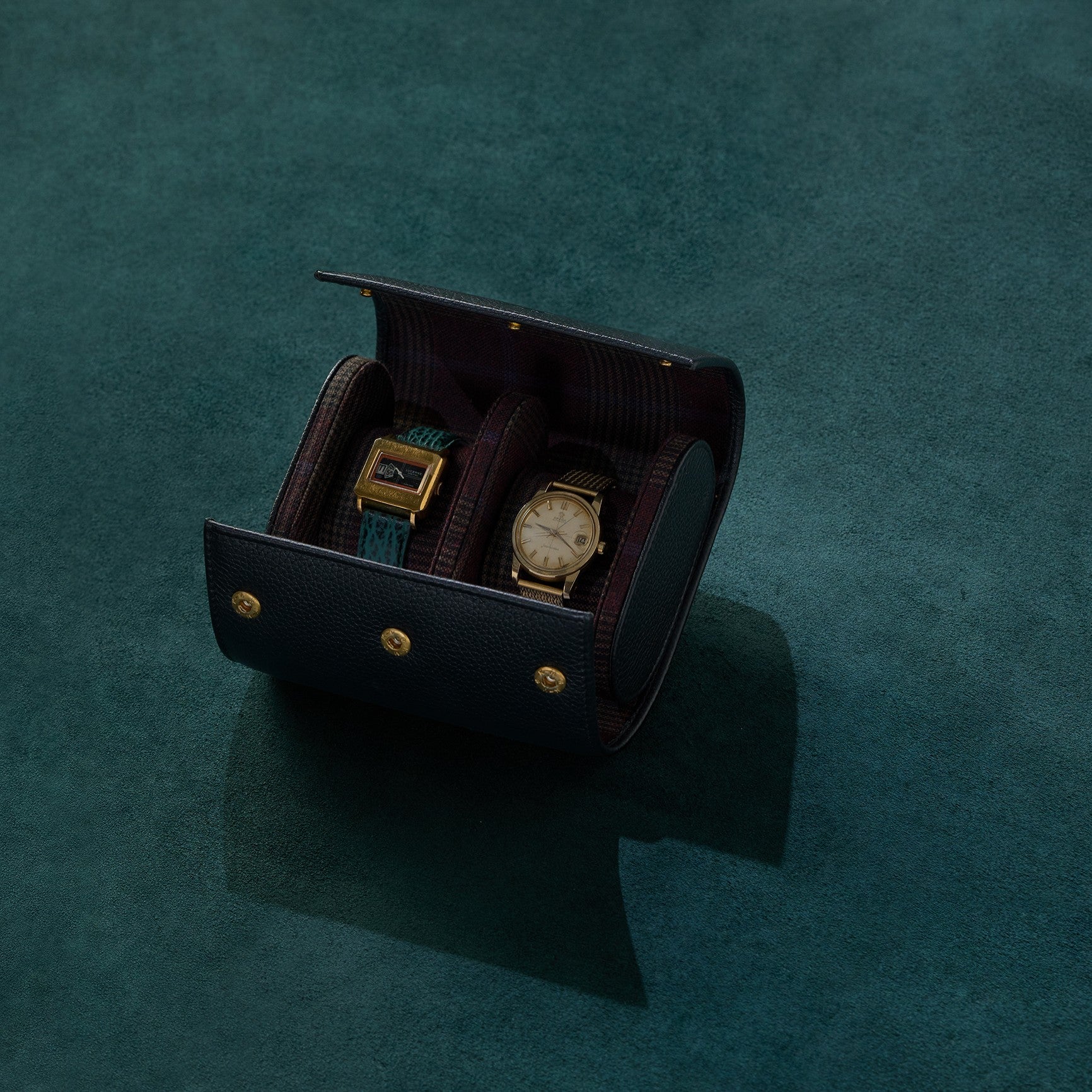 An OBLUM essential, our watch roll is thoughtfully crafted to blend warmth, texture, and timeless style. The interior is lined with classic suiting fabric - wool rich, tactile, and reminiscent of traditional tailoring - to offer the perfect touch and feel for your watches. The exterior is made from deep black milled leather, chosen for its supple character and refined finish. Finished with gold press-stud closures, it carries a distinct vintage sensibility that’s both elegant and enduring.